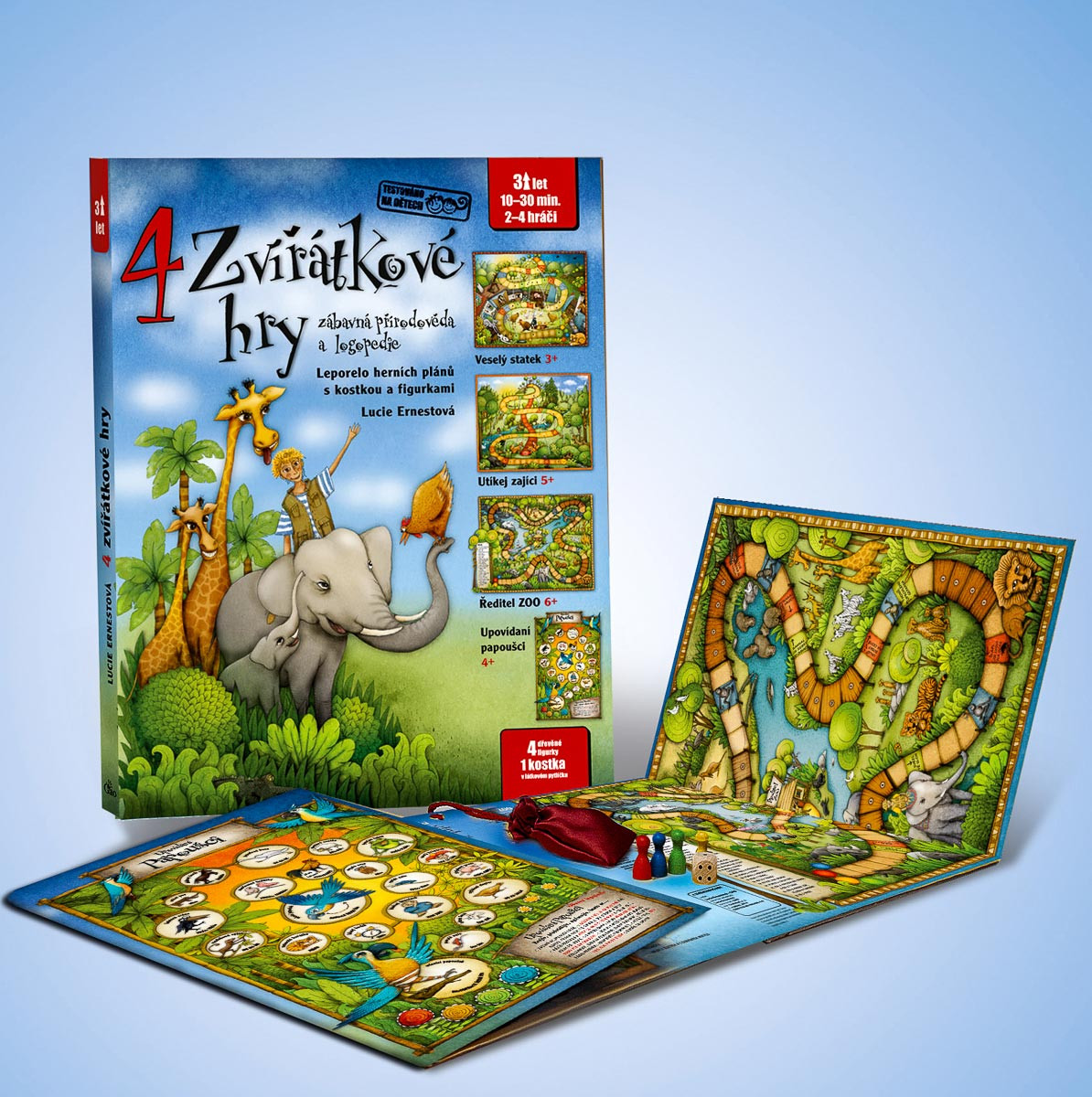 Hry pro předškoláky a malé školáky, které zábavnou cestou seznamují děti s domácími, divokými i exotickými zvířaty. Při jejich hraní vzniká prostor pro vytváření vlastních příběhů a vzájemné špičkování. Knižní leporelo vám velmi dobře poslouží i jako obrázková kniha na poznávání zvířat. UTÍKEJ ZAJÍCI, honí tě lišky! Jednoduchá, ale napínavá hra, kde do poslední chvíle nikdo neví, jestli se jako zajíc dostane ke své rodince. Hry VESELÝ STATEK a ŘEDITEL ZOO jsou intuitivní hry, při kterých jde nejen o zábavu, ale hlavně o seznámení se zvířaty na statku a v ZOO. UPOVÍDANÍ PAPOUŠCI je hra, jejíž těžiště můžete přesunovat od veselého předvádění zvířat a věcí až po zábavné trénování logopedie. Hrajte si s dětmi a buďte jim rovnocennými soupeři. Všechny hry mají jednoduchá pravidla a vše, co potřebujete, je jen figurka pro každého hráče a kostka, které jsou součástí leporela. To si poskládáte pro každou hru dle potřeby.
