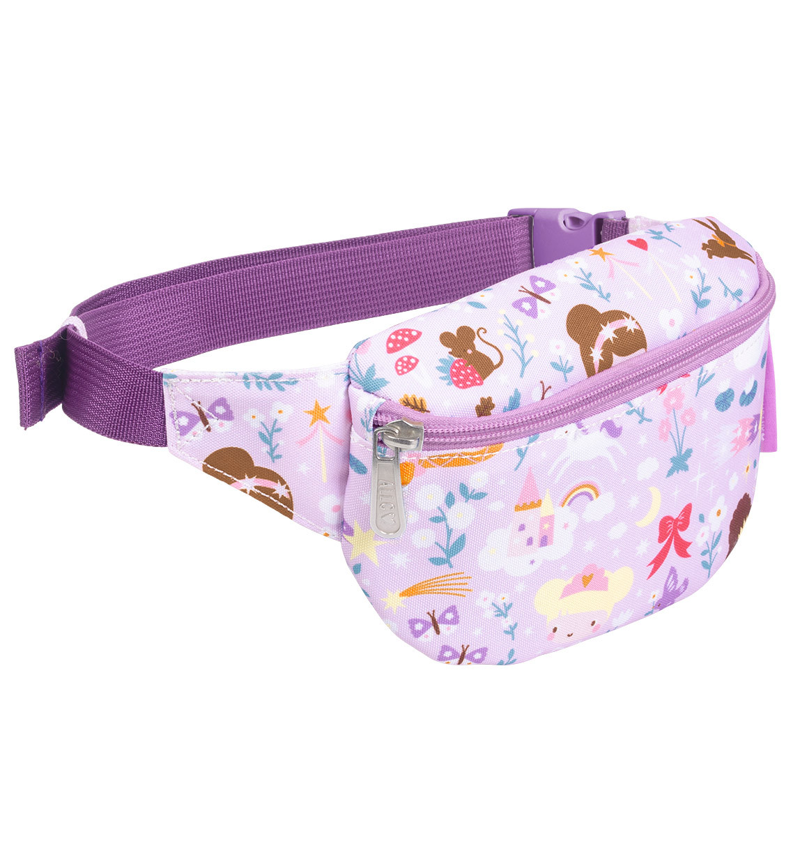 Dětská ledvinka s princeznovským potiskem má nastavitelný popruh. Dá se nosit kolem pasu a lze jí použít i jako crossbody kabelku. Do přední přihrádky se snadno vejde peněženka a mobilní telefon. Zadní kapsa na zip je ideální na drobné cennosti.