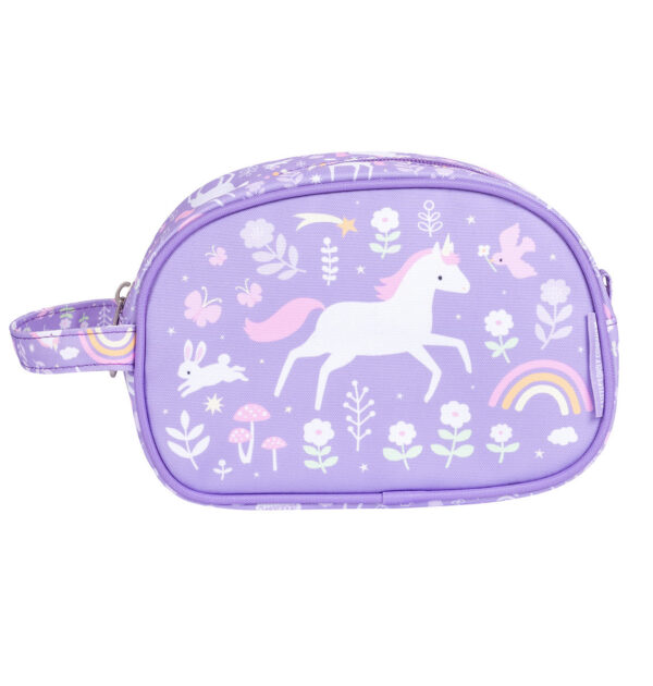 Světle fialová toaletní taštička s jednorožci je ideální na výlety, na letní tábory nebo na dovolenou. Toaletní taštička nabízí prostornou přihrádku s dostatkem místa šampon, mýdlo, zubní kartáček, zubní pastu a další nezbytné potřeby. Toaletní taštička má také praktickou rukojeť pro snadné přenášení a zavěšení.