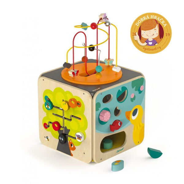 Tato nádherná dřevěná multifunkční kostka obsahuje celkem 8 různých vzdělávacích a zábavných aktivit pro děti od jednoho roku. Stačí otočit kolečkem mlýnku a pozorovat, jak se přesypávají vajíčka různých velikostí a jaký vydávají zvuk. Děti mohou otáčet ozubenými koly nebo se pozorovat v zrcadle. Dále například mohou vkládat rybky a kvítky do jezírka, naučit se druhy ovoce na straně se stromem nebo ho posouvat po větvích. Vrchní část kostky s labyrintem lze vyndat a vložit dovnitř.