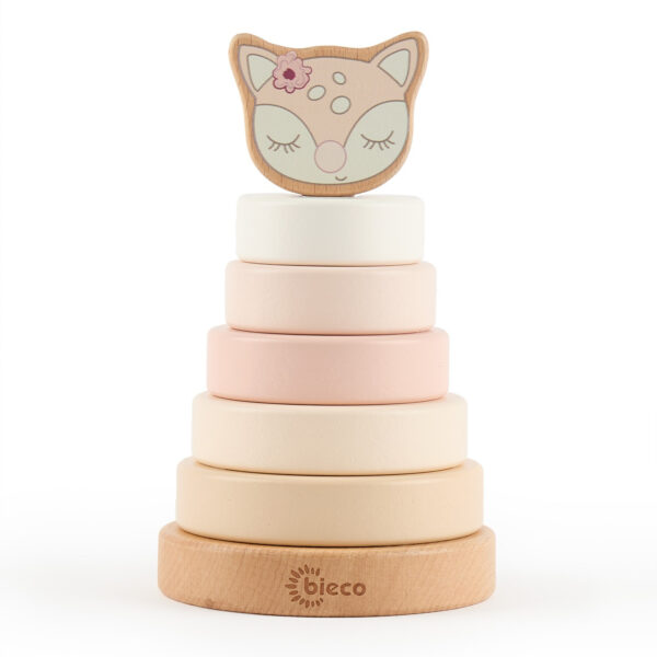 Perfektní hračka pro trénink jemné motoriky, koordinace rukou a očí i rozpoznávání barev. Dílky jsou uzpůsobené pro malé dětské ručičky, díky tomu si děti snadno poradí s jejich manipulací. Skládací pyramida kombinuje dětský design, jemné barvy a kvalitní dřevo a je vhodná pro děti od 12 měsíců. 6 dílků lze třídit podle velikosti a navlékat na dřevěnou tyč. Ta je pevně spojena se základnou, lze ji však sklopit, což zajišťuje bezpečnou hru.