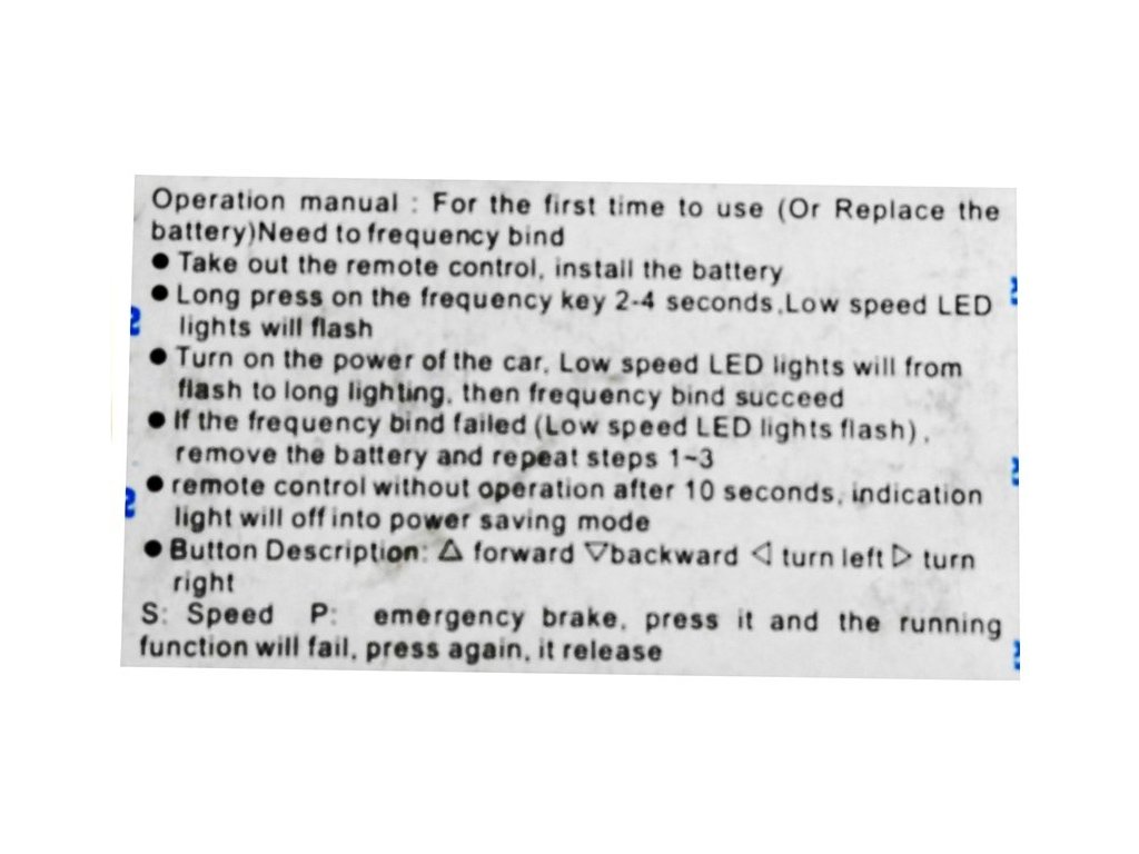 Vložte baterie do dálkového ovládání. Při vypnutém automobilu stiskněte a podržte na dálkovém ovladači tlačítko „frequency“ .Jakmile dioda začne blikat tlačítko pusťte, zapněte autíčko, pokud kontrolka přestane blikat v čase nastartování autíčka, znamená to úspěšné spárování. V opačném případě, vytáhněte baterie z ovladače a opakujte pokyny párování od začátku.