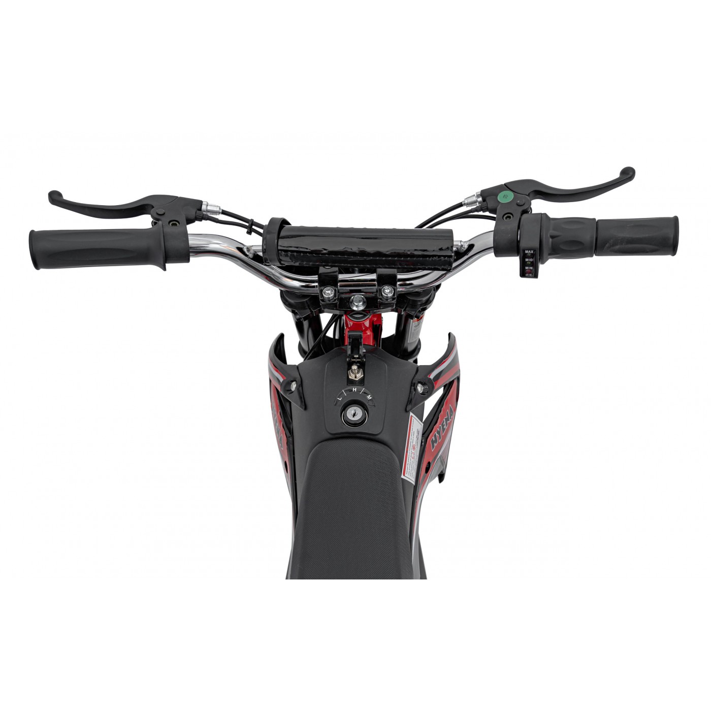 Dětská elektrická motorka má nafukovací kola s hrubým dezénem a motor o výkonu 500W. Mezi vybavení patří přední i zadní kotoučové brzdy a měkké vodotěsné sedadlo.