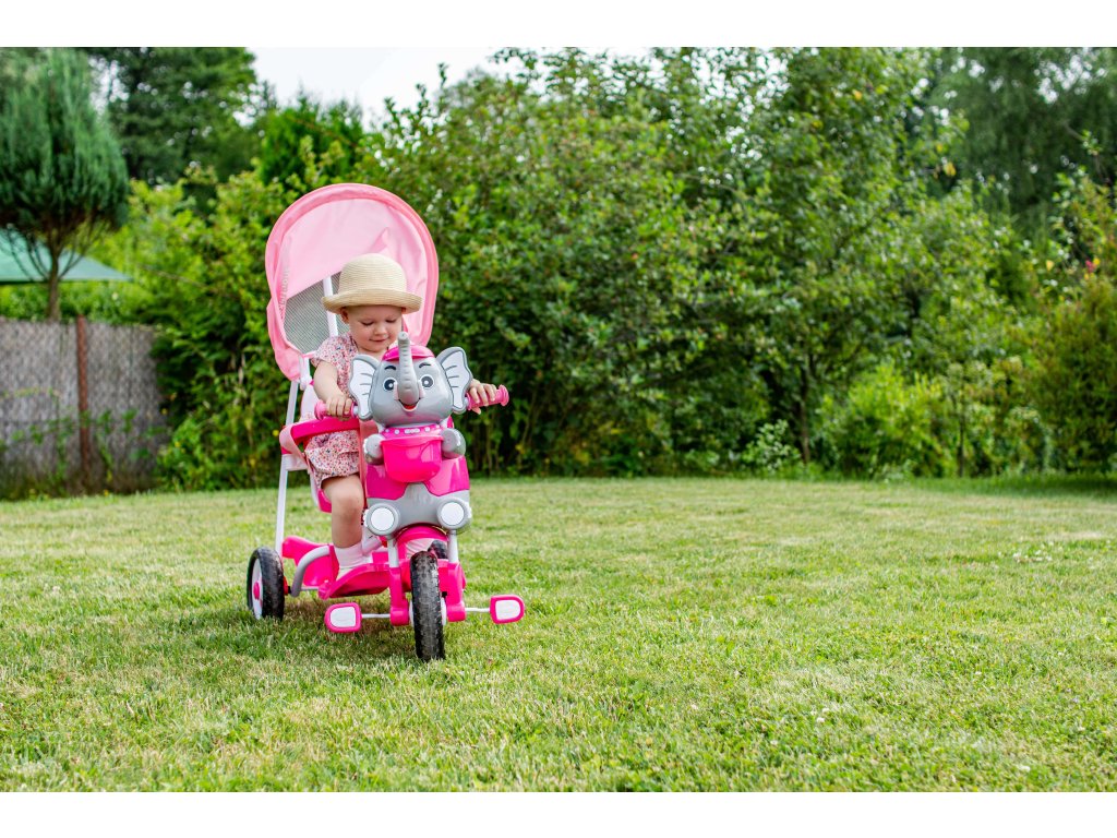Dětská tříkolka nabízí úložný prostor na hračky nebo občerstvení pro dítě. Na hlavičce slona si může dítě hrát s tlačítky, které vydávají zvuky.