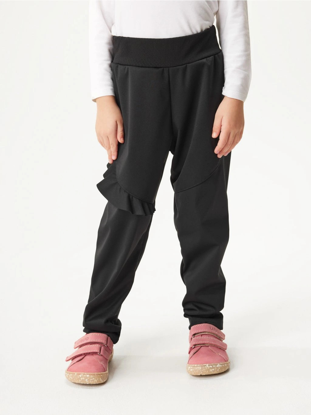 Volnější střih doplněný o pružný pas zajišťuje, že kalhoty dobře drží na těle a přizpůsobují se různým pohybům, ať už dítě běhá, skáče nebo sedí na zemi. Ozdobný volánek je už jen hezkou třešničkou celkového střihu.
