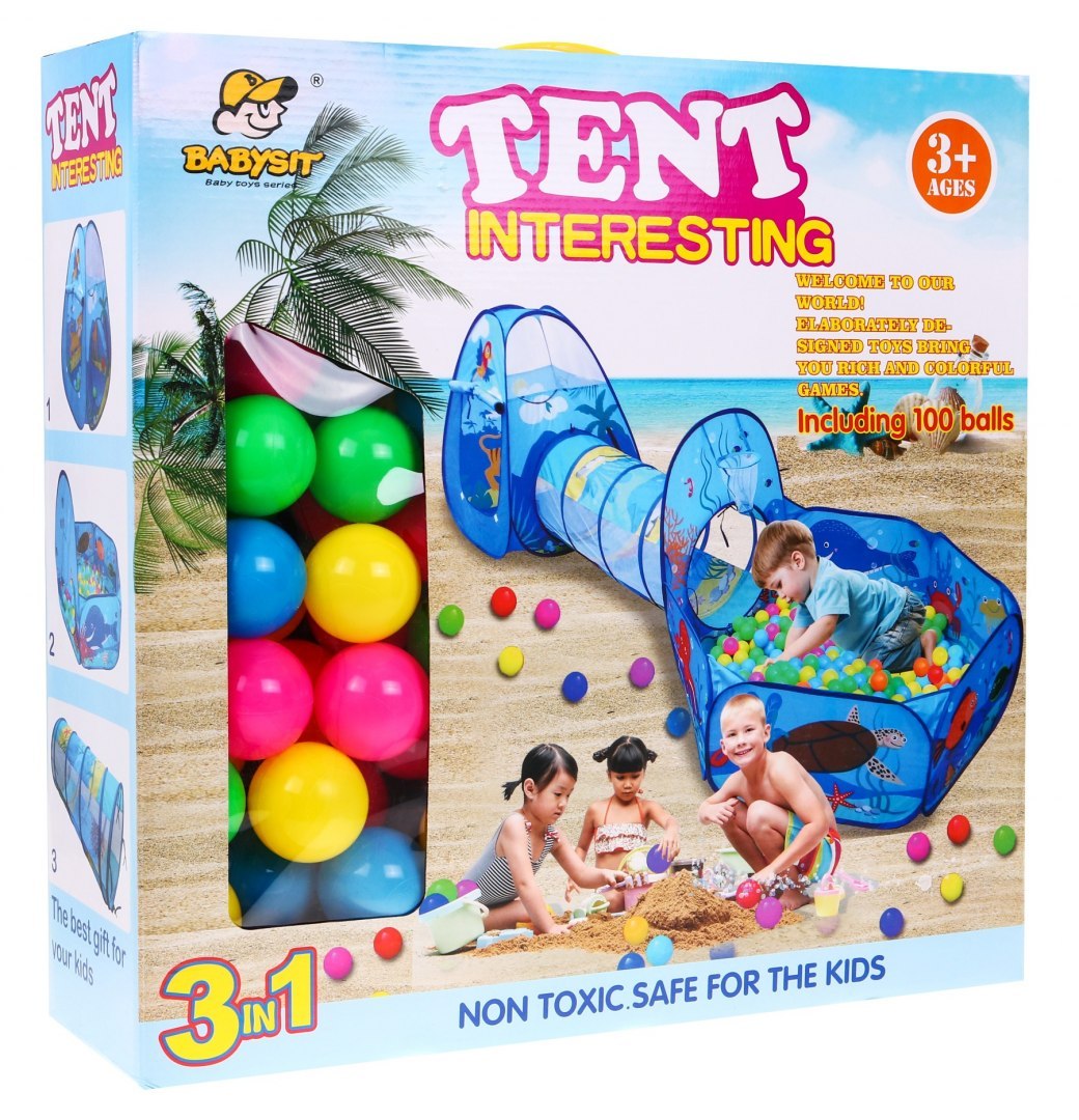 Dětské hřiště 3 v 1 v podobě suchého bazénku s míčky, mini košem, tunelem a stanem. Každý z těchto prvků může být samostatným herním předmětem. Dětské hřiště je rozložené a složené v mrknutí oka a po složení zabírá málo místa. Dětské hřiště je vhodné pro hraní v dětském pokoji i venku na zahradě.