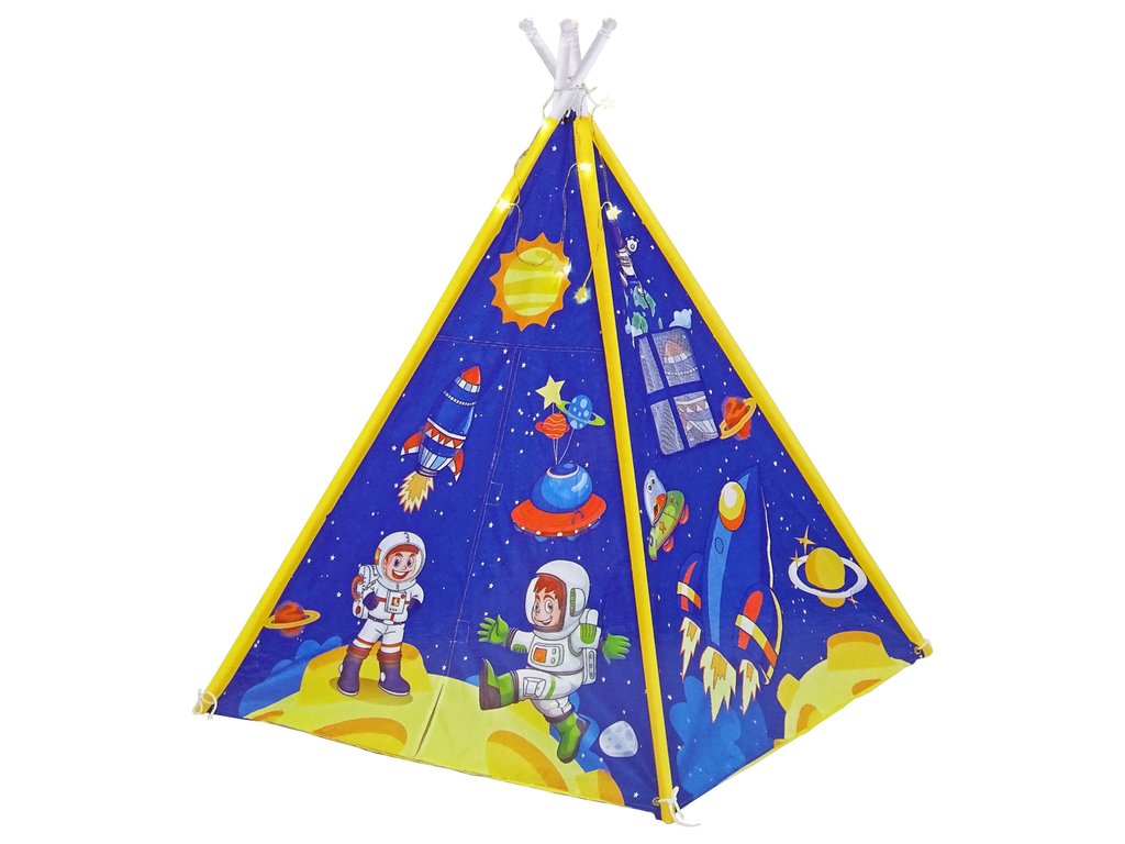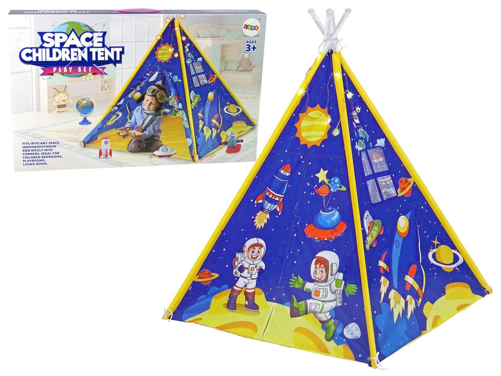 Představujeme dětský stan se svítícími efekty a vesmírným potiskem. Ve stanu si bude vaše dítě moci hrát, ale také odpočívat. Konstrukce obsahuje otevírací dveře, okno se síťovinou a hvězdná světílka, která dodají kouzlo a náladu při večerní zábavě ve vesmíru.Sada obsahuje: