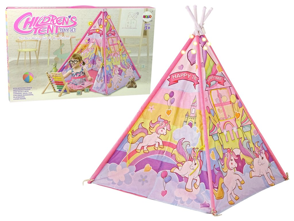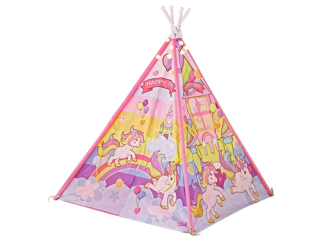 Představujeme dětský stan se svítícími efekty a potiskem s jednorožci. Ve stanu pro princezny si bude vaše dítě moci hrát, ale také odpočívat. Konstrukce obsahuje otevírací dveře, okno se síťovinou a světílka, která dodají kouzlo při večerní zábavě.Sada obsahuje: