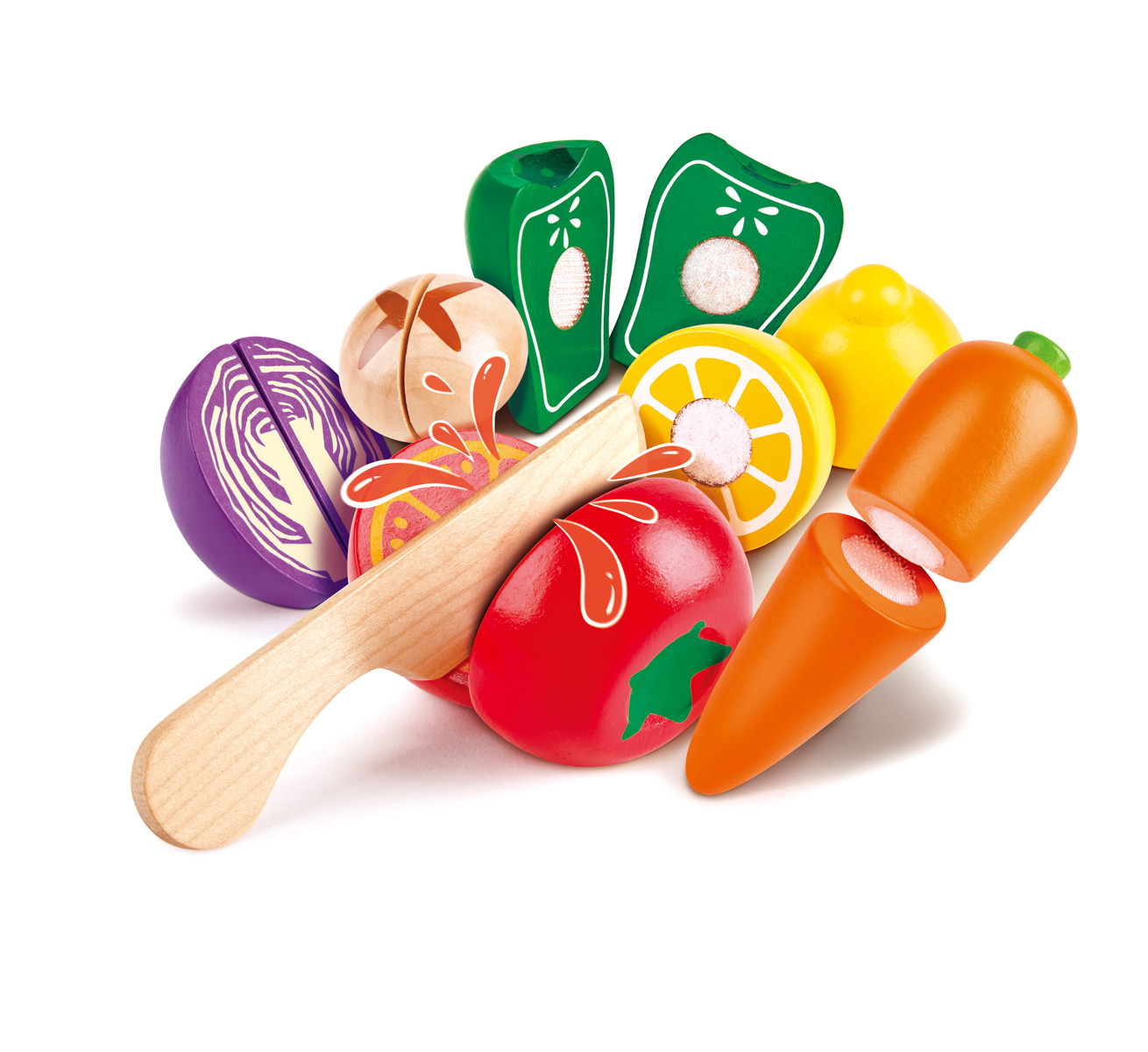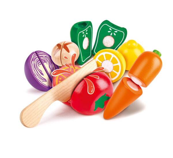 Ukažte dětem, jak krájet zeleninu, jak si jí přidržovat druhou rukou a jak správně otočit nůž. Hra s touto hračkou pomáhá rozvíjet dětskou fantazii, děti si mohou hrát na kuchaře, nebo připravit oblíbenému plyšákovi zdravou svačinku. Můžete také potraviny využít pro hry, které učí děti rozlišovat barvy a tvary.
