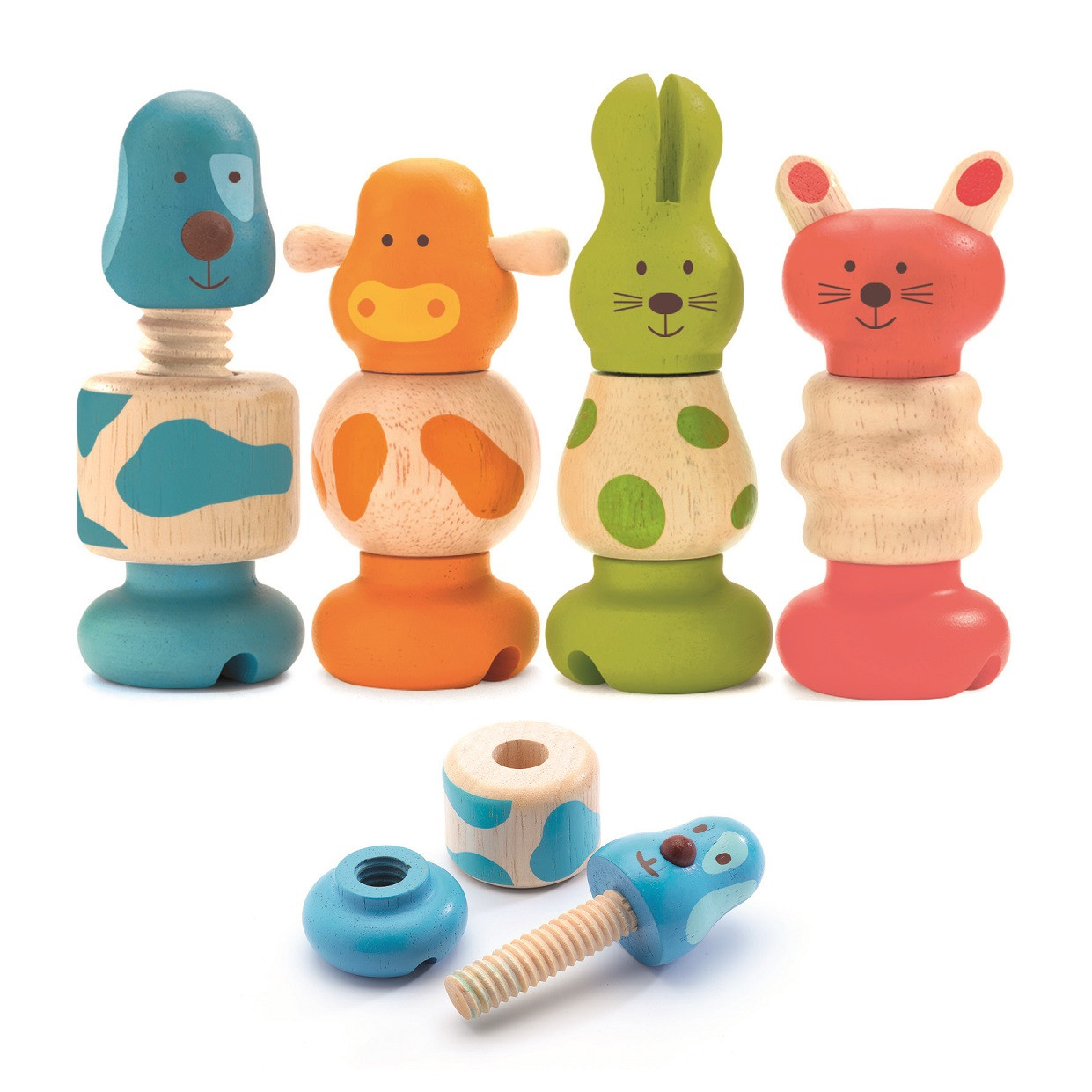 Sada čtyř dřevěných zvířátek. Jednoduchá motorická hra na procvičování zručnosti je ideální pro malé děti od 18 měsíců. Úkolem dětí je spojit pomocí šroubování 4 zvířátka – králíka, psa, kočku a krávu. Hra napomáhá rozvoji jemné motoriky a učí děti soustředění a rozpoznávání barev. Děti si mohou zvířátka sestavit a poté si s nimi hrát, vyprávět si s maminkou příběhy, kde zvířátka žijí a k čemu jsou užitečná. Výška jednotlivých zvířátek je cca 10 cm. Rozměry balení jsou 22 x 12,5 x 6 cm. Vyrobeno ze dřeva. Počet dílků je 12.