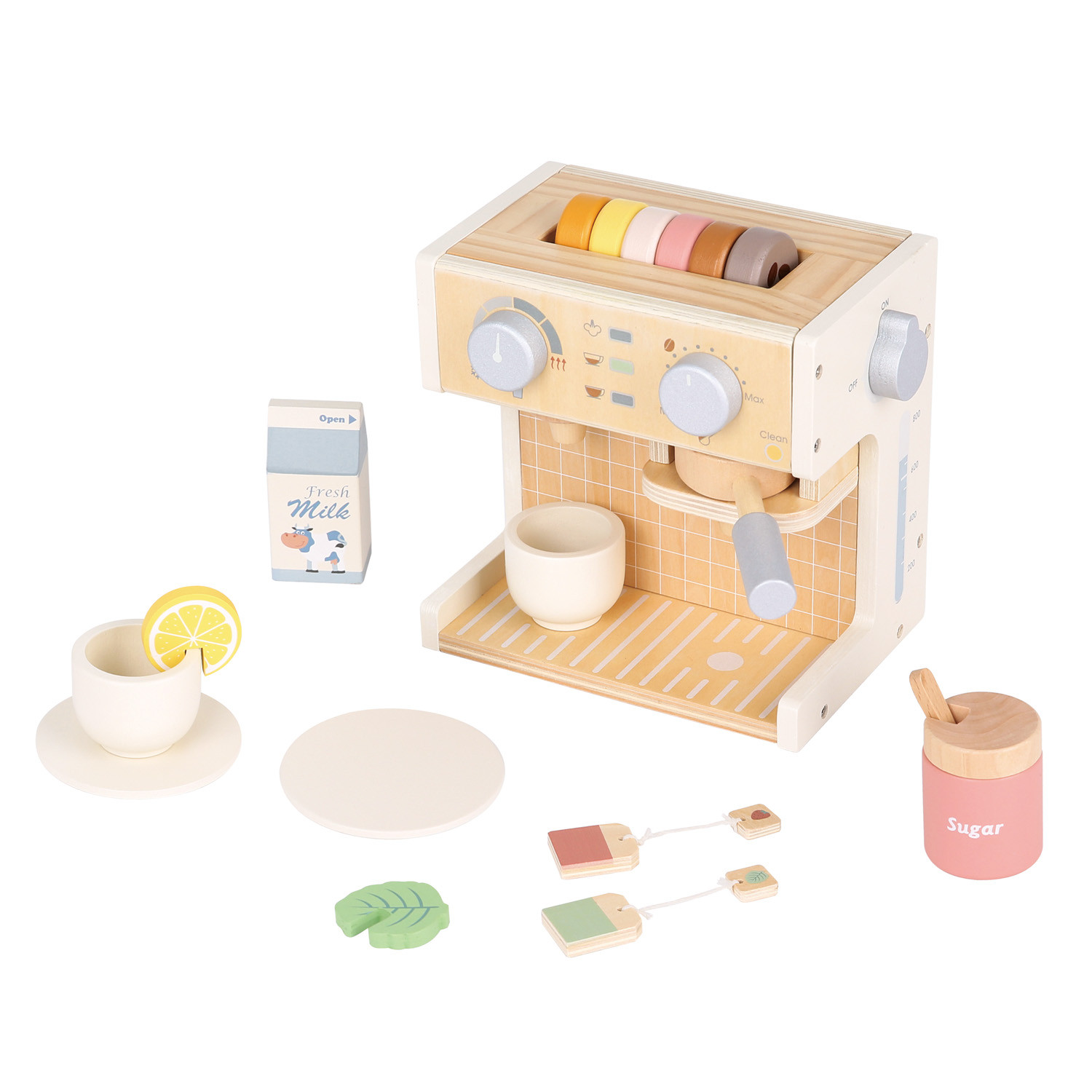 Sada obsahuje pestrou škálu příslušenství. 6 různých barevných kávových kapslí, 2 čajové sáčky, lístek máty, plátek citronu, cukřenku, džbán na mléko a dva šálky s podšálky. Děti si při hře nejen rozvíjejí motorické dovednosti, ale také kreativitu a schopnost komunikace. Hra s kávovarem je ideální příležitostí k procvičování koordinace ruky a oka a nápaditému hraní rolí.