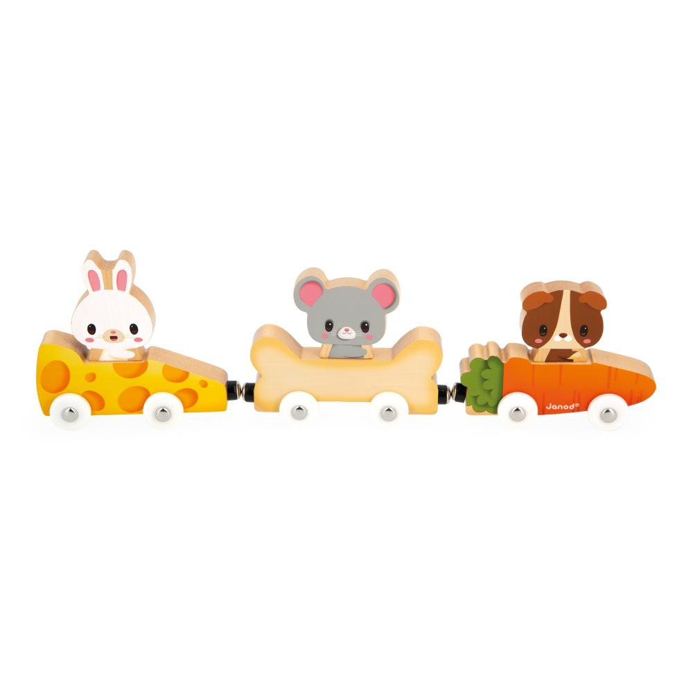 Hračka se skládá ze 3 aut (mrkev, kost a sýr) a 3 dřevěných postaviček (králík, pes a myš). Dítě může každé zvířátko přiřadit k jeho oblíbenému jídlu nebo je umístit do vozidla dle vlastního výběru. Kamarádi z farmy se mohou projet samostatně, nebo lze autíčka spojit jako vláček pomocí magnetů.