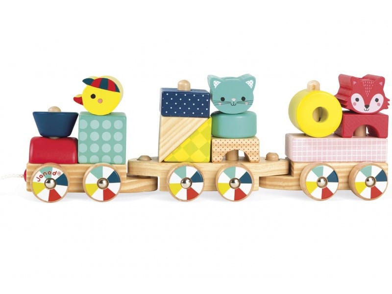 Dřevěný vláček se zvířátky není jen tahací hračka. Je složený z kostiček různých barev a tvarů. Lze si tedy mnoha různými způsoby poskládat z kostek lokomotivu a dva vagóny s kuřátkem, kočičkou a liškou. Na každém vozíku s kolečky jsou dvě tyčky, na které si děti kostičky navlékají. Délka vláčku je 48 cm. Hračka je vyrobena z kvalitního dřeva, barvy jsou nezávadné a netoxické. Vláček je pro děti od 12 měsíců.