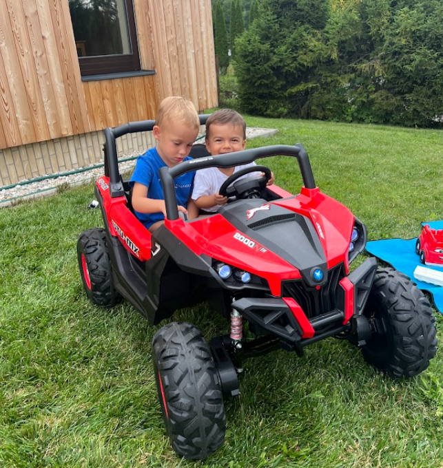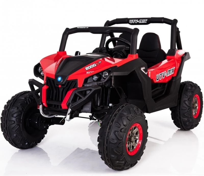 Buggy SuperStar 4×4 Motory – 4x45WPohon – Variabilní pohon dvou nebo čtyř kol (ovládaný spínačem) 4×4 nebo 4×2,Baterie – 2 x 12V / 7AhOvladač – 2,4 GHz -3 rychlosti, -Tlačítko bezpečnostního zastavení,Kola -EVA pěnová kola, -35 x 15 cm,Tlumiče -2 x vpředu -2 x vzaduNastavitelné, závitové odpružení,PřevodovkaPomalý start,Přední / zadní,3 rychlostní stupně vpřed (ovládání pomocí knoflíku řazení),Světla -LED světla, -Přední / zadní, -Spínač světel,Vybavení -Zvukový panel -MP3 -SD -FM rádio -Načtené melodie, -AUX -USB -Bluetooth -Zvuky na volantu,KlíčOtevírání dveříSedadlo -Černá odvětrávaná umělá kůže, -Bezpečnostní pásy, -49 x 18 x 34 cm,KufrZadní úložiště,Rozměry -Velikost vozidla -Délka 125 cm, -Široký 83 cm, -Výška 81 cm,Hmotnost vozidla 27,2 kg,Velikost kartonu124 x 92,5 x 40 cm,Hmotnost kartonu 34,5 kg,Maximální zatížení 40 kg,Odbavení 23 cmDalší vybavení -Instrukce + montážní sada, -1500 mA nabíječka, -Kabel mini jack, -Plachta