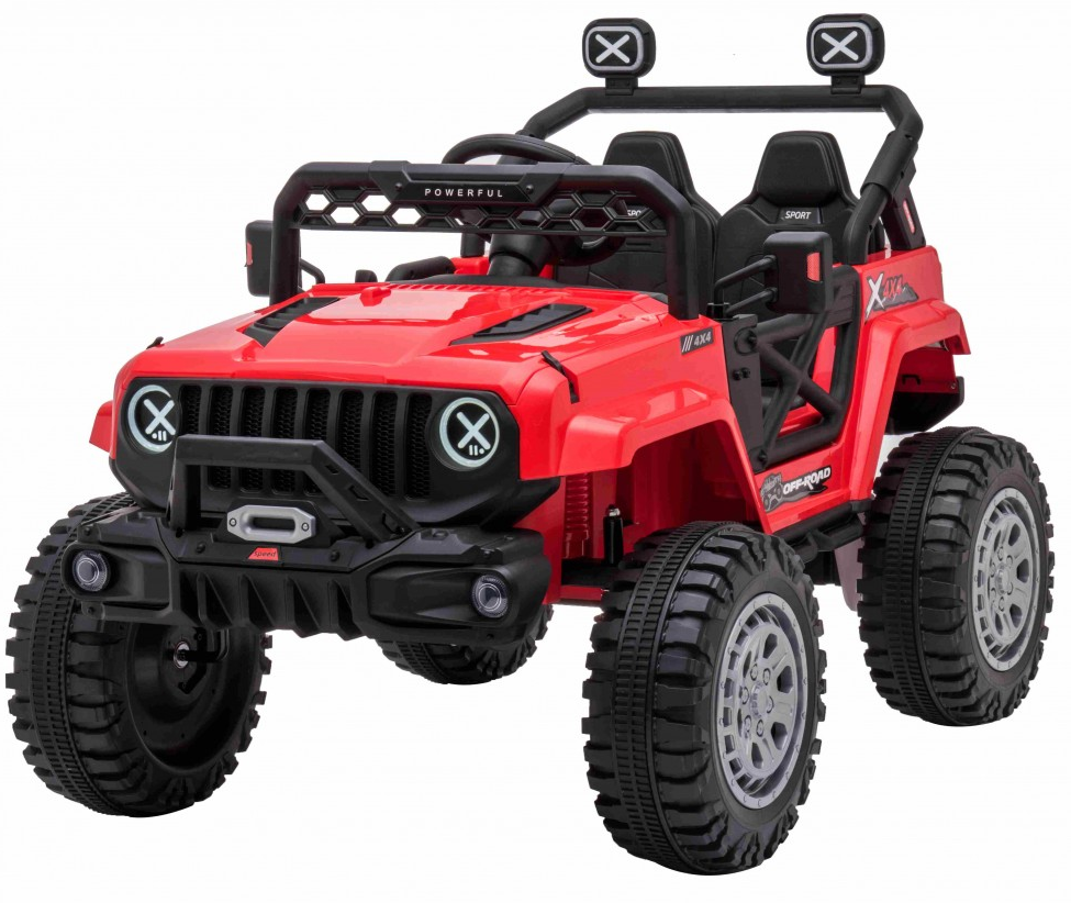 Elektrické autíčko jeep Off-road Speed má čtyři motory s výkonem 35W a dvě baterie s kapacitou 12V 7Ah. Vozítko  má nosnost až 30 kg. O pohodlnou jízdu se postarají pěnová EVA kola. Dítěti jízdu určitě zpříjemní hudební panel s integrovanými melodiemi, FM rádiem, Bluetooth, MP3 a vstupem pro USB. Sedadlo je vyrobeno z ekologické kůže.