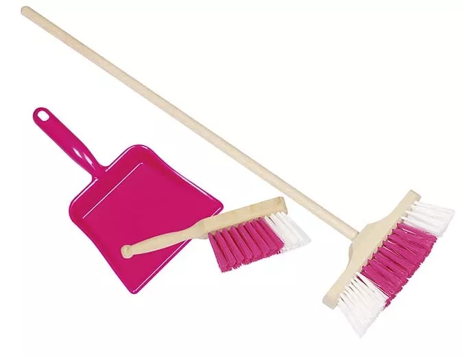 Uklízecí sada laděná do růžové barvy, určená pro malé pomocníky v domácnosti. Praktická velikost a jednoduché provedení usnadní zapojení dětí do běžných úklidových činností.