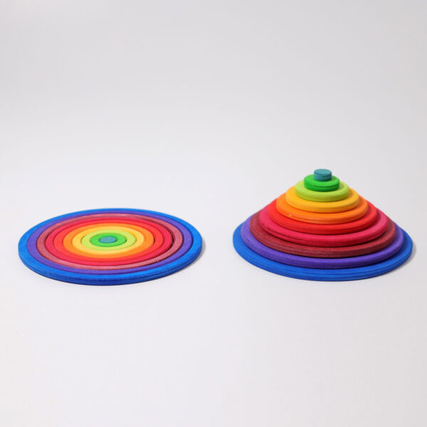 Velká kreativní skládačka pro hraní na podlaze. Soustředné kruhy a prsteny umožňují vytvářet mnoho neobyčejných staveb. V kombinaci s dalšími stavebními sadami Grimm's lze budovat moderní architekturu a znovu a znovu vytvářet nové fantasy světy. V sadě je celkem 20 ks. Vyrobeno z březového dřeva, vše je barvené netoxickou lazurou na vodní bázi. Průměr kruhů je 2-20 cm. Hračka je vhodná pro děti od 5 let.