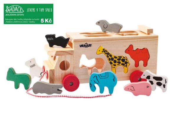 Krásný dřevěný vkládací kamion se zvířátky učí dítě znát tvary zvířátek a vkládat je do patřičných otvorů. Hračka je i určena pro rozvoj motoriky. Kamion je vyroben z kvalitního dřeva, dá se použít i jako tahací hračka.Dřevěný kamion je poctivě vyrobe: je velký (délka 27 cm, výška 12 cm, šířka 12 cm) a váží skoro 500 g. Zvířátka, kterých je celkem 10, je možné vkládat ze 3 stran. Zadní stranou návěsu pak dítě vložená zvířátka může vyndat. Těchto 10 dřevěných zvířátek dětem slouží také jako figurky pro volné hraní. samotný kamion děti mohou využít také jako tahací hračku nebo prostě krásné velké dřevěné nákladní auto, které uveze i mnohem víc, než jen svých 10 zvířátek.