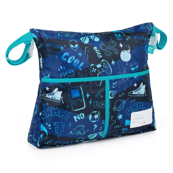 Jednoduchý kapsář na lavici z kvalitního a pevného materiálu. Jedna velká a dvě menší kapsy jsou určeny na uschování drobností každého školáka (vodové barvy a jiné školní pomůcky). Horní velká kapsa je uzavíratelná na zip, dvě boční kapsičky jsou volně přístupné. Pytlík je opatřen jmenovkou a popruhy s přezkami pro uchycení k lavici.