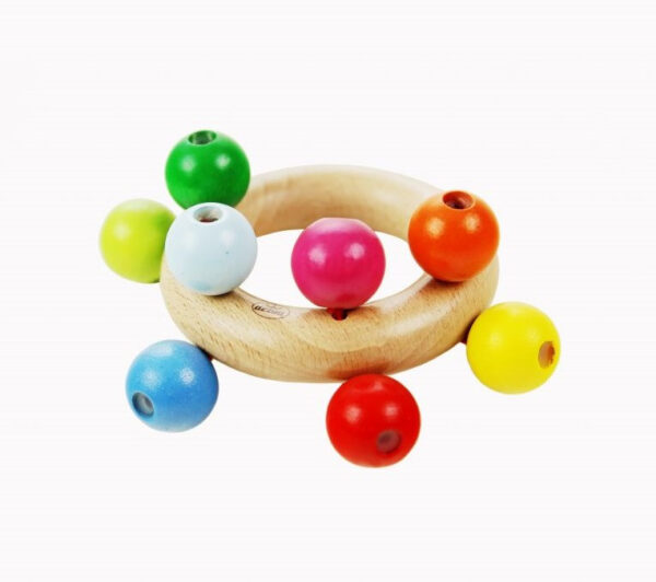 Hračka do ruky pro nejmenší je velmi lehká. Kroužek má průměr 60mm a na něm jsou upevněné barevné kuličky. Vhodná hračka k procvičování jemné motoriky rukou. Určeno pro děti již od 6 měsíců. Hračka je zdravotně nezávadná.
