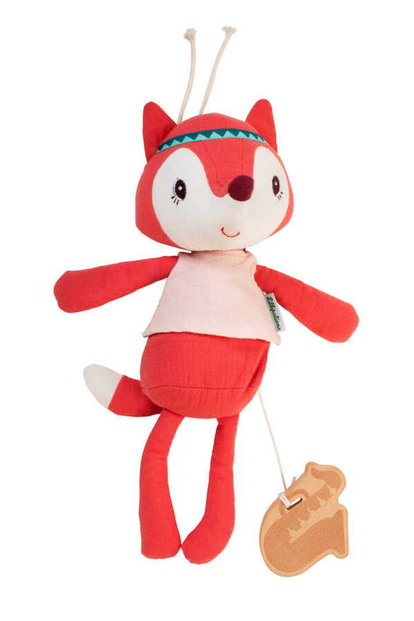 Textilní hračka pro děti již od narození. Liška Alice má uvnitř ukrytý hudební strojek. Stačí zatáhnout za dřevěný nástroj a melodie se spustí. Lišku lze zavěsit i na postýlku pro potěšení nejmenších. Ideální hračka pro uspávání dětí. Rozměry hračky jsou 30 x 11 cm. Lze prát v pračce na 30°C na jemný cyklus po odebrání hudebního strojku a dřevěného nástroje. Použité materiály: 100% organická bavlna a FSC dřevo. Výplň hračky je 100% recyklovaný polyester (certifikace GRS). Hudební strojek hraje známou melodii “Yesterday once more".