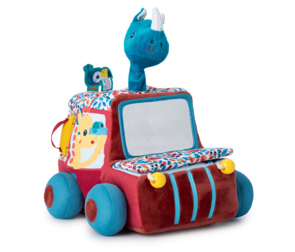 Safari vůz se lvem Jackem za volantem je připraven vyrazit na objevnou cestu do divočiny. V autíčku se veze pasažér nosorožec Marius, který vykukuje hlavou přes střechu a dohlíží na cestu. Autíčko malým dobrodruhům od 9 měsíců nabízí pestré barvy, rozmanité textury, zrcátko a mnoho dalších aktivit. Hračka rozvíjí smysly a jemnou motoriku.