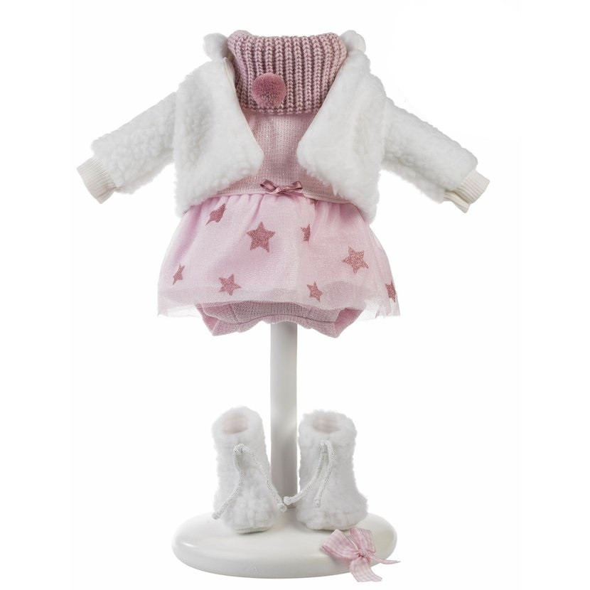 5dílný obleček s ozdobnou gumičkou s mašlí do vlásků pro panenku Llorens velikosti 35 cm. Vyrobeno ručně ve Španělsku, součástí balení je plastové ramínko.