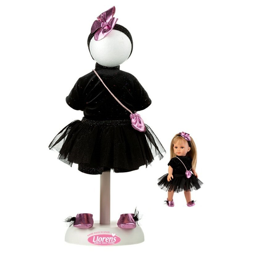 5dílný set: 3 kusy oblečení, ozdobná gumička s mašlí do vlásků a kabelka pro panenku Llorens velikosti 35 cm. Vyrobeno ručně ve Španělsku, součástí balení je plastové ramínko.