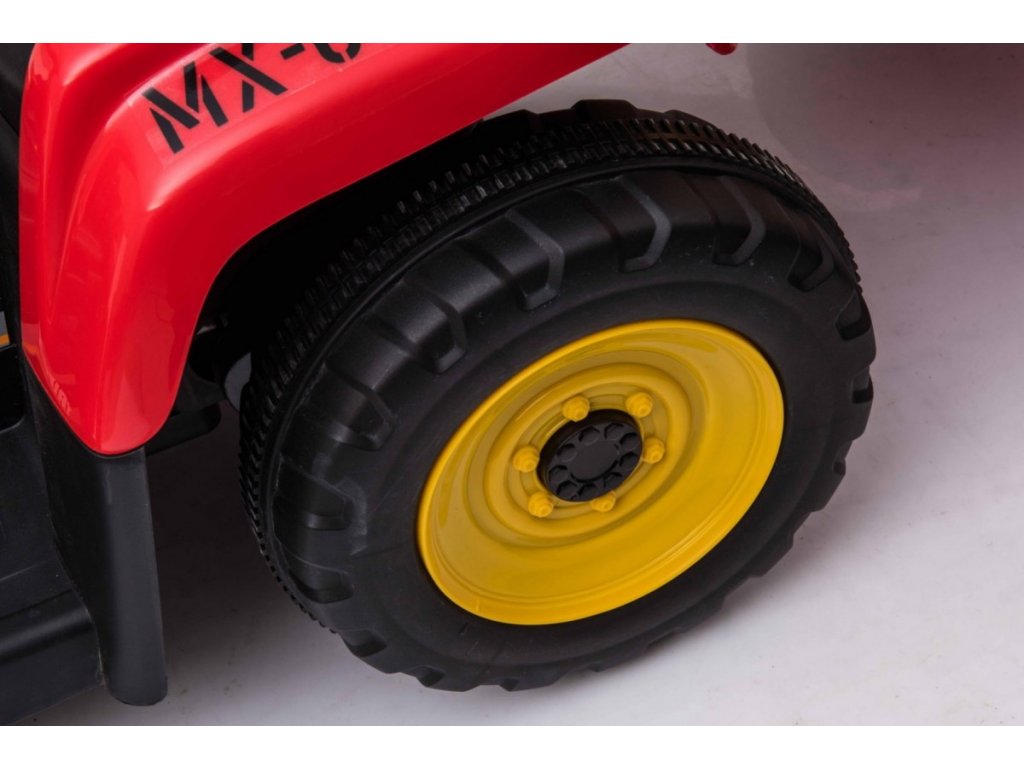 Konstrukce elektrického traktoru je založena na čtyřech kolech. Lehká plastová kola proti propíchnutí. Dětský traktor je poháněn 12V 7Ah baterií, která je doprovázena motory 2x45W. Traktor je určen pro chlapce i dívky – jediným omezením je zatížení do 30 kg.