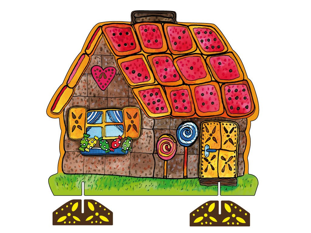 Divadelní kulisa, doplněk  scény k pohádce Perníková chaloupka do loutkového divadla. Perníková chaloupka, ve které spolu svorně žijí ježibaba s ježidědkem. Všechny komponenty jsou vysekávány z desky knihařské lepenky o síle 3 mm. Materiál je kvalitní, velmi pevný a odolný, tvrdostí srovnatelný se dřevem. Je také ekologický a mimořádně příjemný na hmat a do dětské ruky. Výška kulisy je 22 cm.