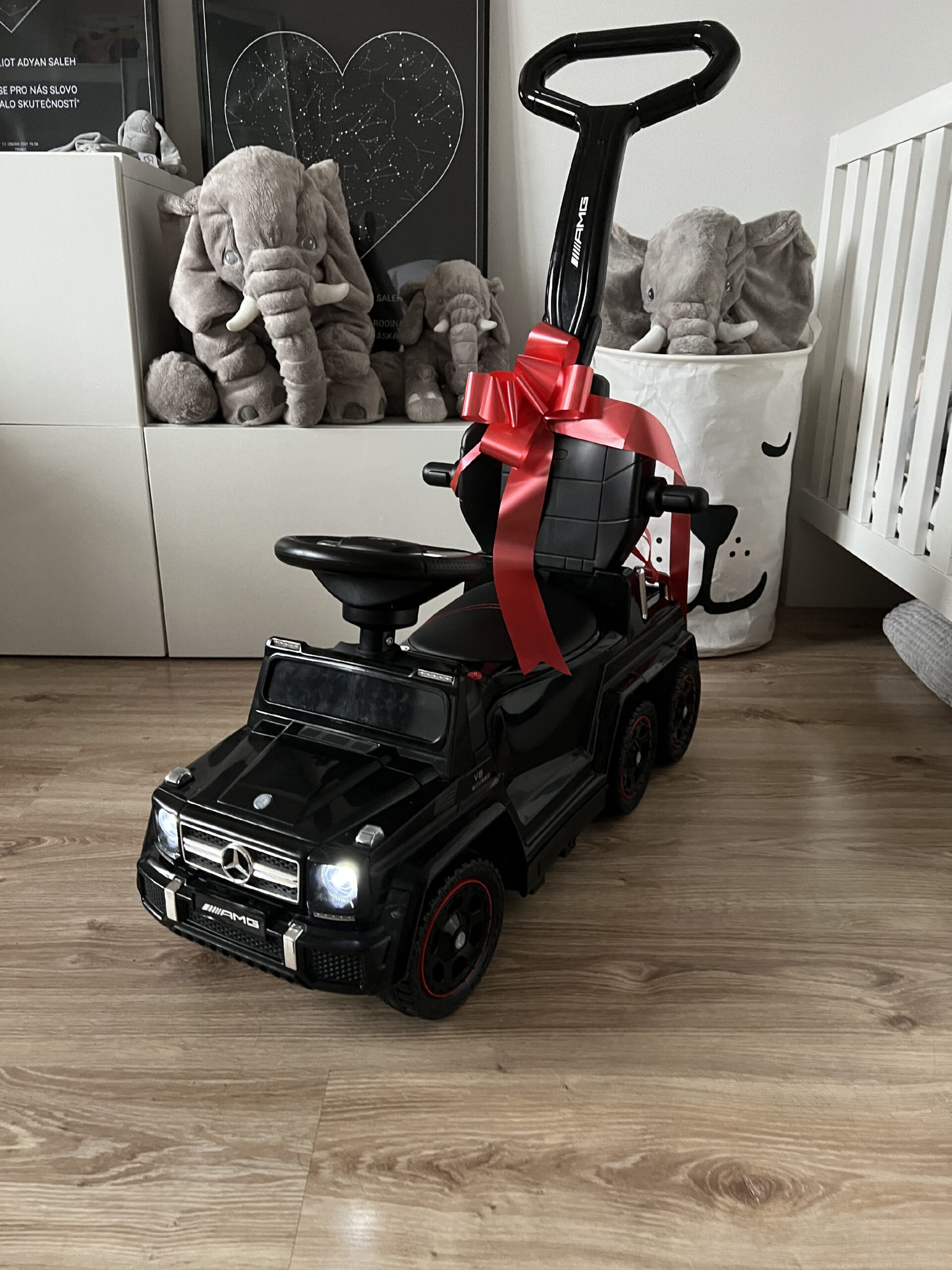Mašli snadno připevníte na elektrické autíčko či jiný dárek a pak už stačí jednoduše předat překvapení oslavenci.