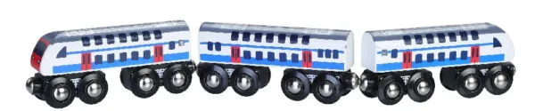 Super příměstská vlaková souprava bude ozdobou každé dřevěné vláčkodráhy. Tři dvouposchoďové vagóny jsou v krásném modrobílemé provedení. Tento vlak s lokomotivami na obou koncích dojede na místo určení a zpět a nikdy se nepotřebuje otočit.Vláčkodráhy a doplňky Maxim lze kombinovat se všemi dalšími dřevěnými vláčkodráhami na trhu.