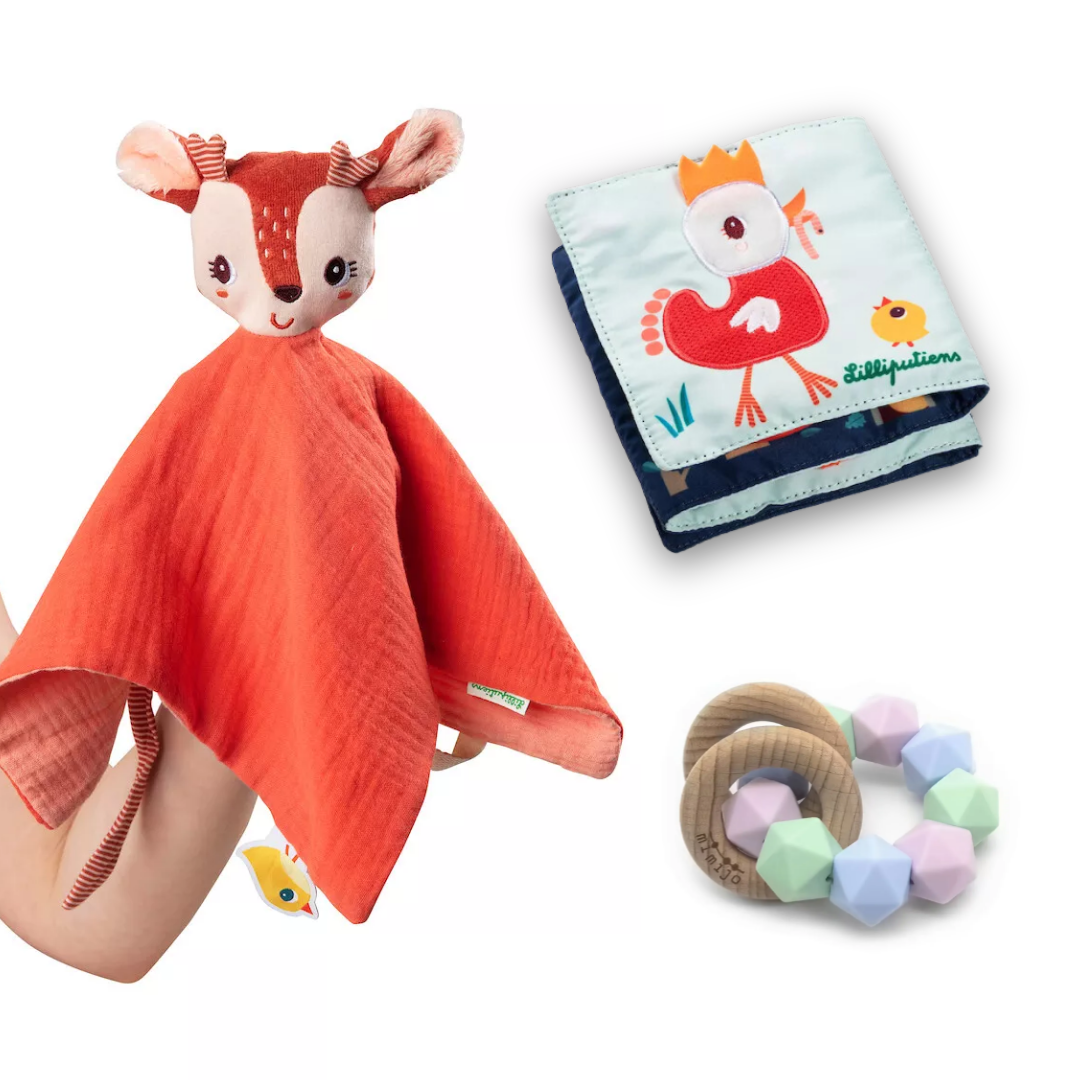 Sestavili jsme pro vás výhodný balíček se třemi produkty, které se stanou nerozlučnými kamarády vašeho miminka. Muchláček jelínek Stella, první látková knížka a kousátko.