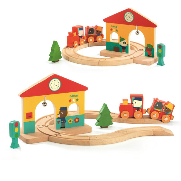 První dřevěná vláčkodráha pro děti od 18 měsíců. Na děti čeká malý okruh z 10 kolejnic se stanicí, semaforem, jedlí a magnetickým vláčkem, složeným z lokomotivy a vagónku. Děti budou nadšené při skládání různých okruhů. Můžou si vybrat otevřený či zavřený okruh. Zvoneček zacinká při každém průjezdu vlaku stanicí. Rozměry složené dráhy jsou cca 29 x 25 x 15 cm, rozměry balení jsou 18 x 16 x 15,5 cm.