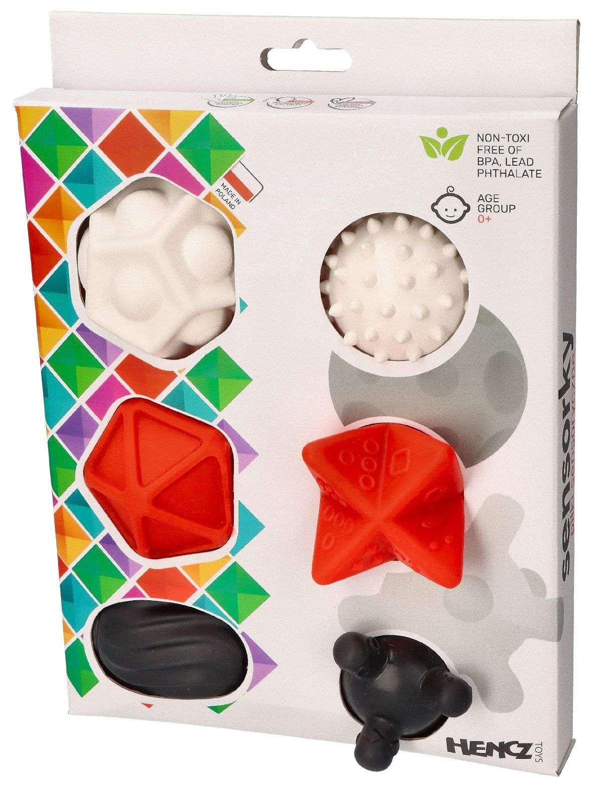 Každý míček má jinou strukturu, která navíc podporuje rozvoj hmatu. Batole je může uchopit, mačkat, kutálet a otáčet, což pomáhá procvičovat obratnost a koordinaci oko – ruka. Měkké a lehké míčky jsou pro dítě bezpečné, takže je lze použít jak k samostatné hře, tak k jemné masáži těla dítěte, která pomáhá uvolnit napjaté svaly.