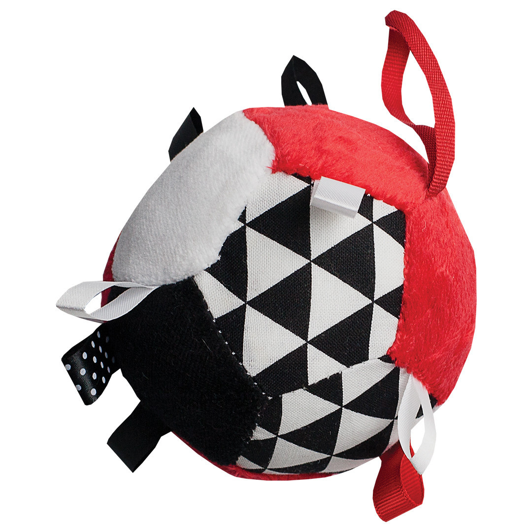 Po narození děti nevnímají barvy a tvary. Zaměřením na černé a bílé geometrické vzory se stimuluje vývoj mozku. Převaha černých a bílých prvků navíc rozvíjí správné vnímání barev. Díky texturám a všitým značkám může dítě pomocí hry cvičit jemnou motoriku. Uvnitř míčku je bezpečně zašité chrastítko, díky kterému je hračka ještě zajímavější a vzrušující. Míček lze zavěsit nad postýlku nebo ke kočárku či autosedačce. Rozměry míčku jsou 9 x 9 cm.