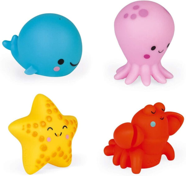 Stříkací hračka do vody. V sadě jsou 4 mořská zvířátka, měkké plastové postavičky pro nejmenší děti již od 10 měsíců. S malými stříkajícími zvířátky bude každodenní povinné večerní koupání plné zábavy a potěšení. Navíc lze se zvířátky hrát různé vymyšlené příběhy. Čas určený na koupání tak zaručeně rychle uběhne. Rozměry produktu jsou 4,5 x 4,5 x 5,8 cm. Vyrobeno z plastu vhodného do vody.