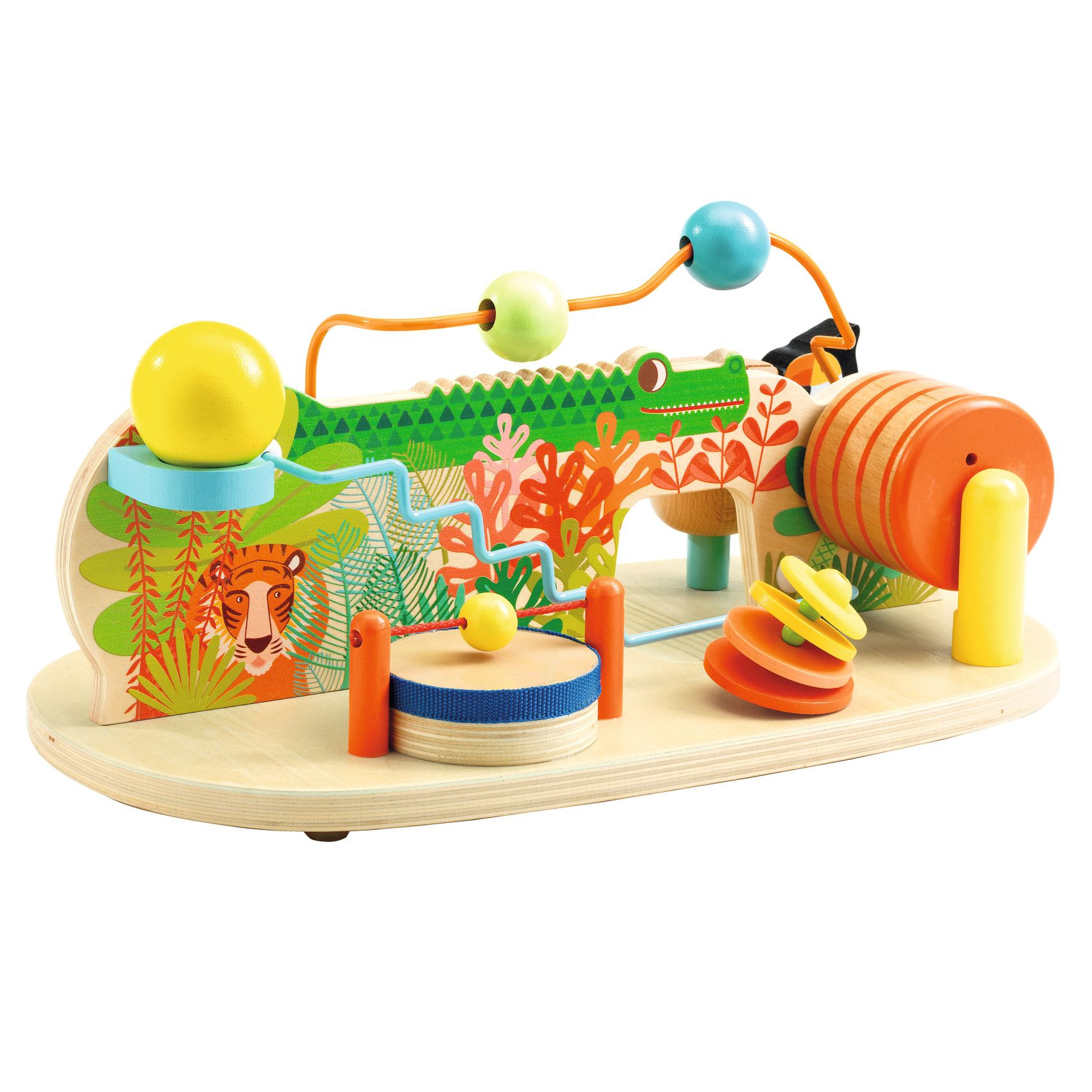 Multifunkční stolek s 8 zvukovými aktivitami pro děti od 18 měsíců. Děti si hrají a zároveň objevují, jak vytvořit 8 různých zvuků. Ťuk-ťuk dělá papoušek klováním na dřevěný válec, klap-klak dělá rotující kolečko. Multifunkční stůl je stabilní díky malým a nárazuvzdorným nohám.