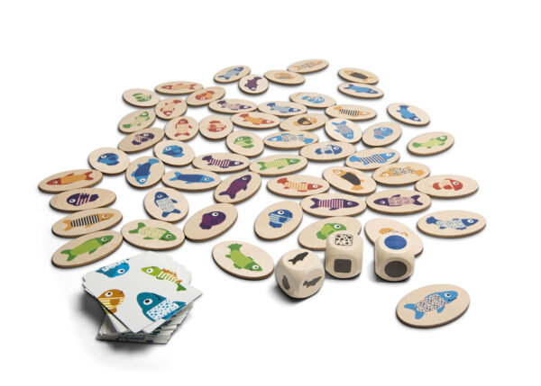 Hra obsahuje: 54 ryb, 6 x 4 x 2,6 cm, 54 karet, 7,5 x 5,5 cm, 3 kostky.