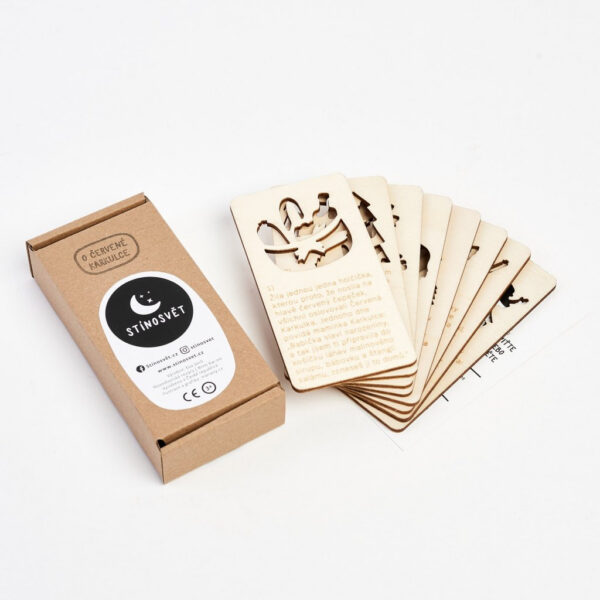 Klasická pohádka o děvčátku, které se vydalo samotné lesem navštívit babičku a cestou potkalo vlka. Pohádková sada obsahuje osm kusů dřevěných kartiček určených k prosvícení. Produkt je koncipován pro rodiče tak, aby mohli zároveň promítat i číst příběh svým dětem. Délka samotného vyprávění trvá asi 8 minut, ale může se dle Vaší fantazie a zaujetí dítěte protáhnout i mnohem déle. Promítá se na strop nebo na zeď pokoje.