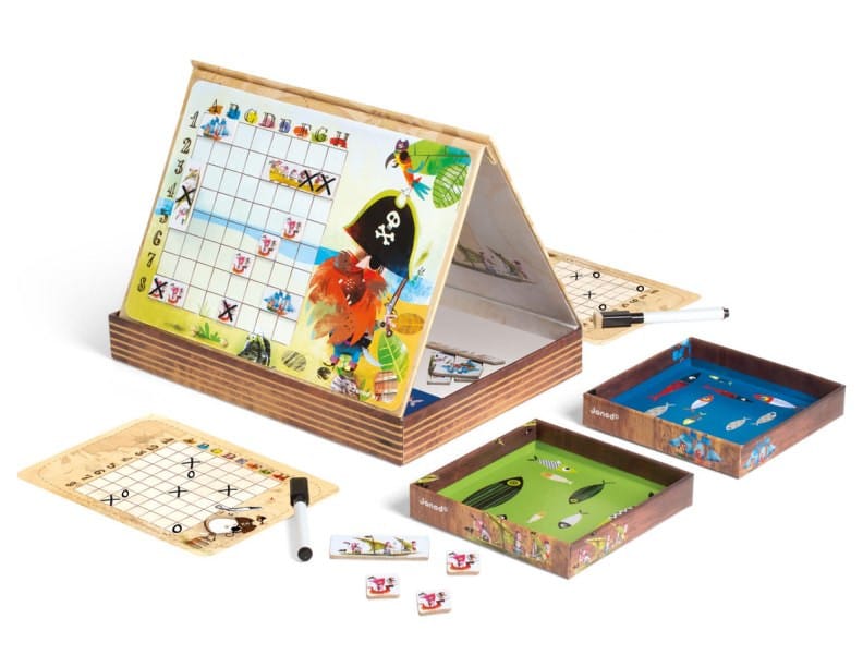 V této pirátské námořní bitvě je vaším úkolem zničit nepřátelskou flotilu dříve, než jsou všechny vaše lodě potopeny a vyhrát bitvu! V roli kapitána můžete připravit svoji bitevní strategii a dovést své námořníky k vítězství.! Nasadťe flotilu, naplánujte svůj útok a bitva může začít. • 2 úrovně hry (2 stojany) • 20 lodí • 2 smazávací fixy • Rozměry: 22 x 4 x 30 cm • Věk: 4 – 7 roků