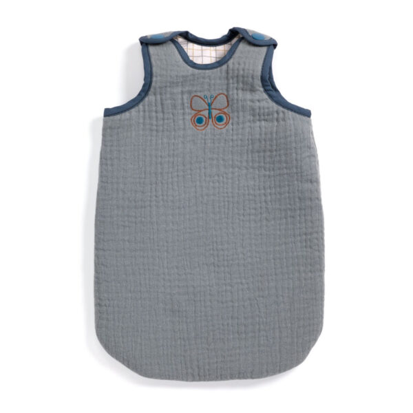 Spací pytel z bavlněného mušelínu s vyšívaným motýlkem. Doplněk z řady Pomea v šedé barvě ocení malé starostlivé maminky. Panenka je po celém dni unavená a zavírají se jí oči. Uložte ji do spacího pytle a máte jistotu, že bude v bezpečí a v teple. Vložit panenku do pytle je jednoduché i pro menší děti, stačí odepnout suchý zip.
