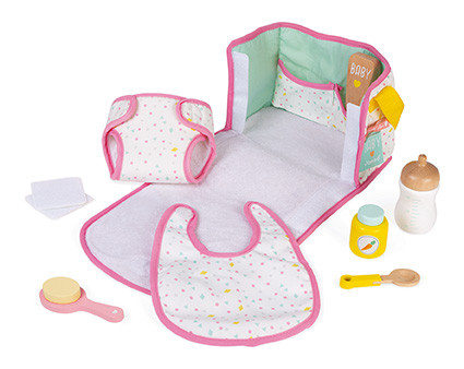 Přebalovací taška pro panenky vhodná pro děti od 3 let. Najdete zde vše, co vaše dítě potřebuje k odpovídající péči o svou panenku: 1 bryndák, 1 plenka, 1 lžíce, 1 kartáč, 1 malá miska, 1 tuba krému, 1 láhev a 2 bavlněné pleny. Taška se může pochlubit mnoha vnitřními kapsami. Po rozložení vznikne froté přebalovací pult, na který vaše dítě může pohodlně položit svoji panenku.