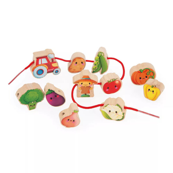 Náš přítel farmář a jeho traktor musí sklidit zeleninu a zamávat strašákovi, kterého při práci míjí. Sada dřevěných navlékacích korálků s motivem zeleninové farmy pro děti od 2 let. Hračka rozvíjí jemné motorické dovednosti a zručnost. Tato vzdělávací hračka se skládá z 11 dřevěných dílků (zelenina, traktor a strašák) a 2 šňůrek. Na konci každé šňůrky jsou pevné hroty, které usnadňují navlékání. Vše je uzpůsobeno pro malé dětské ručičky. Hračka v raném věku také podporuje fantazii vašeho dítěte, protože dílky jsou 3D a stávají se tak skutečnými figurkami. Na této farmě čekají ne nejmenší děti vtipné příběhy a skvělé úroda!