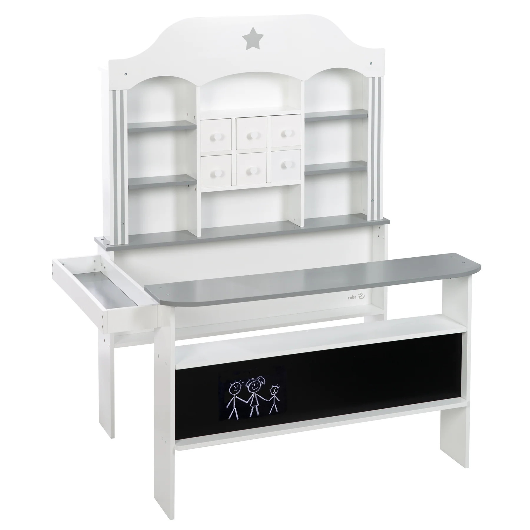 Dřevěný obchůdek v elegantním bílo-šedém provedení je ideální hračkou pro kreativní hry na prodávání a nakupování. Skvěle se hodí jako pekárna s kavárnou, cukrárna nebo obchod s potravinami nebo farmářskými produkty, fantazii se meze nekladou.