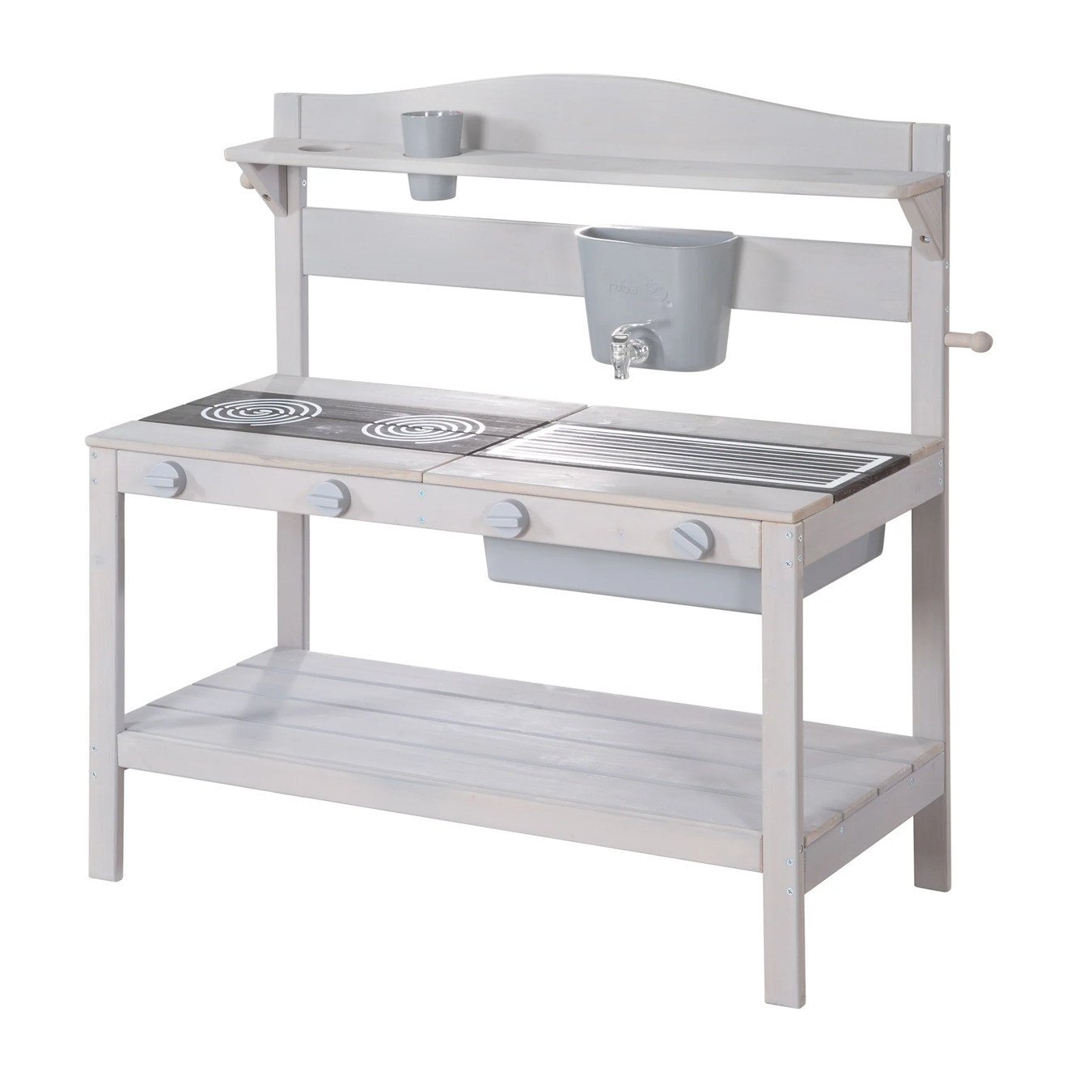 Venkovní kuchyňka Roba je ideální na zahradu, terasu i do vnitřních prostor a nabízí dětem nekonečné možnosti hraní rolí a kulinářských dobrodružství. Obsahuje dvě odnímatelné desky s grilem a varnou deskou, hrnec, poklici, obracečku, 4 otočné knoflíky, odnímatelnou mísu s nádobou na vodu a funkčním kohoutkem, 2 hrnky a 2 háčky. Velký odkládací prostor poskytuje variabilní úložný prostor pro příslušenství a ingredience, takže hra je vždy přehledná.