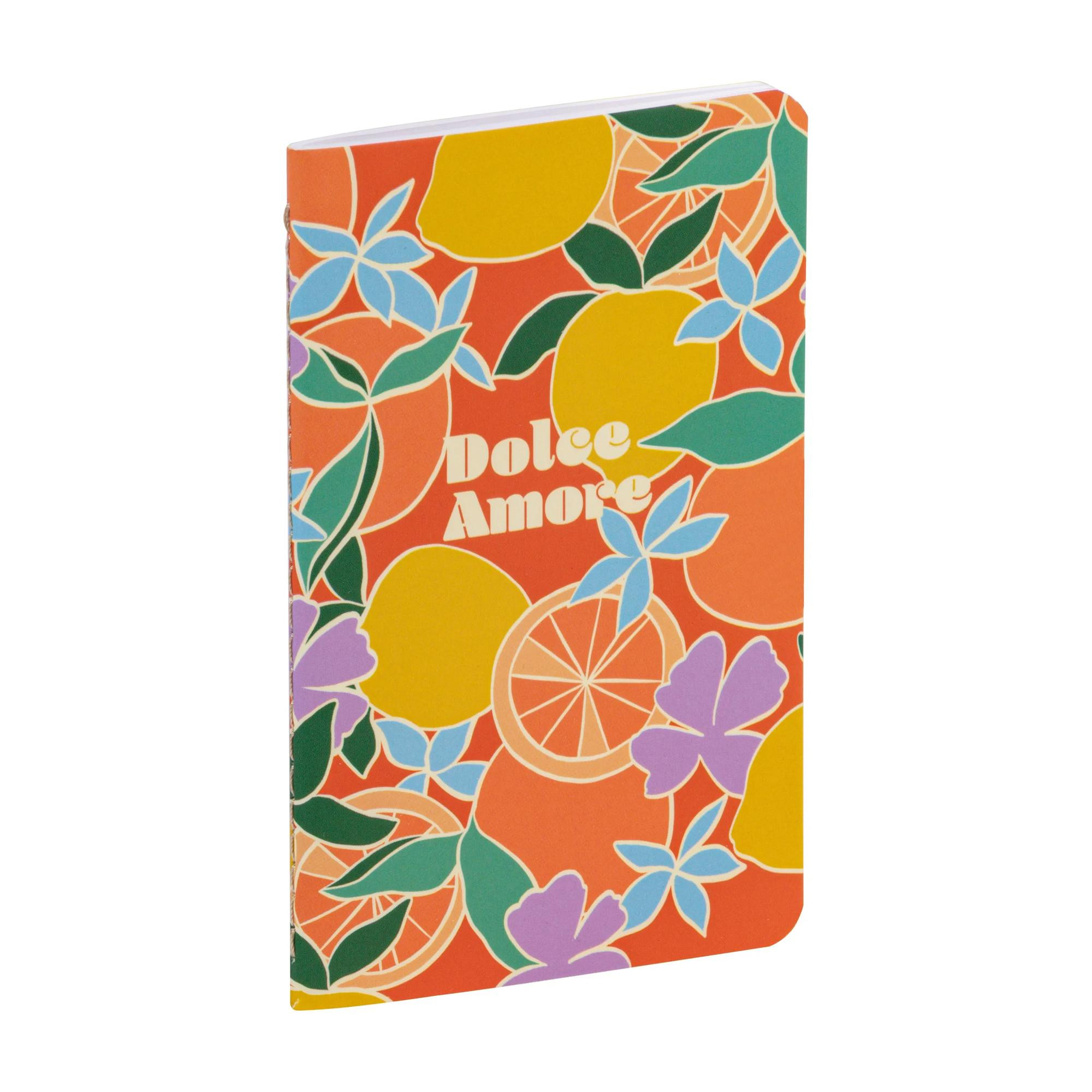 Stylový malý sešit z kolekce Dolce Amore je ideální na rychlé poznámky nebo jako originální dárek. Má pevnou šitou vazbu, kvalitní bílý papír bez linek a obálku s letními motivy květin, citrusů a pruhů. Design evokuje italské léto a radost ze života – svěží barvy, květinové a citrusové motivy. Díky kompaktní velikosti se vejde do kapsy nebo kabelky.