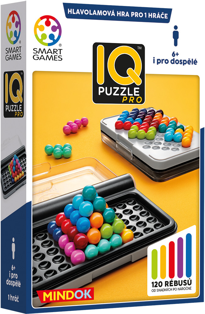 Otestujte a posilte své IQ s touto skvělou cestovní hrou! Logická hra z řady SMART games pro jednoho hráče od 6 let IQ Puzzle Pro obsahuje 120 rébusů ve třech herních módech, ve 2D i 3D. Horní část krabičky obsahuje jednu herní desku pro 2D rébusy a speciální desku pro 3D rébusy – pyramidu. Spodní část krabičky přináší další tvar desky pro 2D rébusy. Cílem je poskládat jednotlivé dílky složené z kuliček buď do plochy, nebo do pyramidy. A to vše v malé kompaktní krabičce, ideální na cesty! Tento hlavolam velice zábavným způsobem otestuje vaši prostorovou představivost.