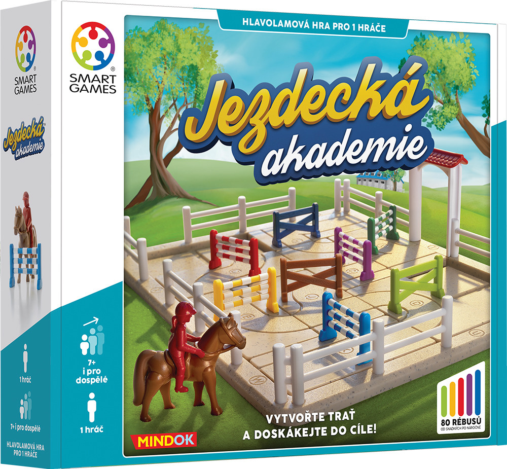 Logická hra pro 1 hráče od 7 let. Sestavte trať a proskákejte do cíle! Jezdecká akademie je krásná a chytrá hlavolamová hra nejen pro všechny milovníky koní. Sestavte překážkovou trať pro svého parkurového koně. Stejně jako ve skutečných překážkových závodech musí i tady kůň překonat překážky v přesně daném pořadí. Sestavte správnou trať, skočte do sedla a vydejte se přes překážky! Zvládnete vyřešit všech 80 rébusů?