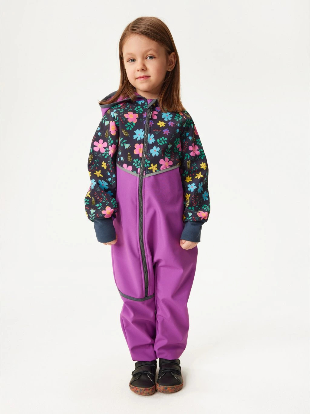Podzimní dny nemusí být šedé, když je rozzáří softshellová kombinéza v ostružinové barvě posetá jemnými kytičkami. Tento model spojuje praktičnost s něžným vzhledem, takže potěší malé objevitelky i jejich rodiče.